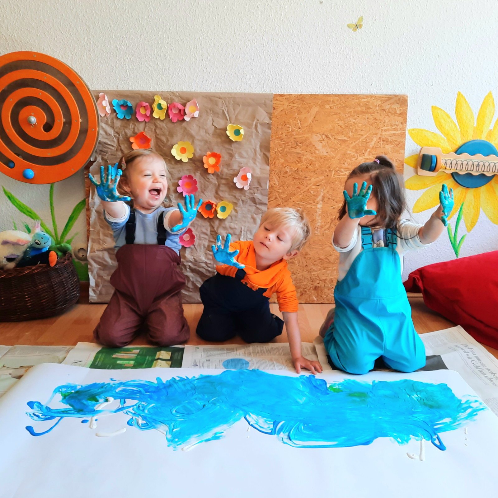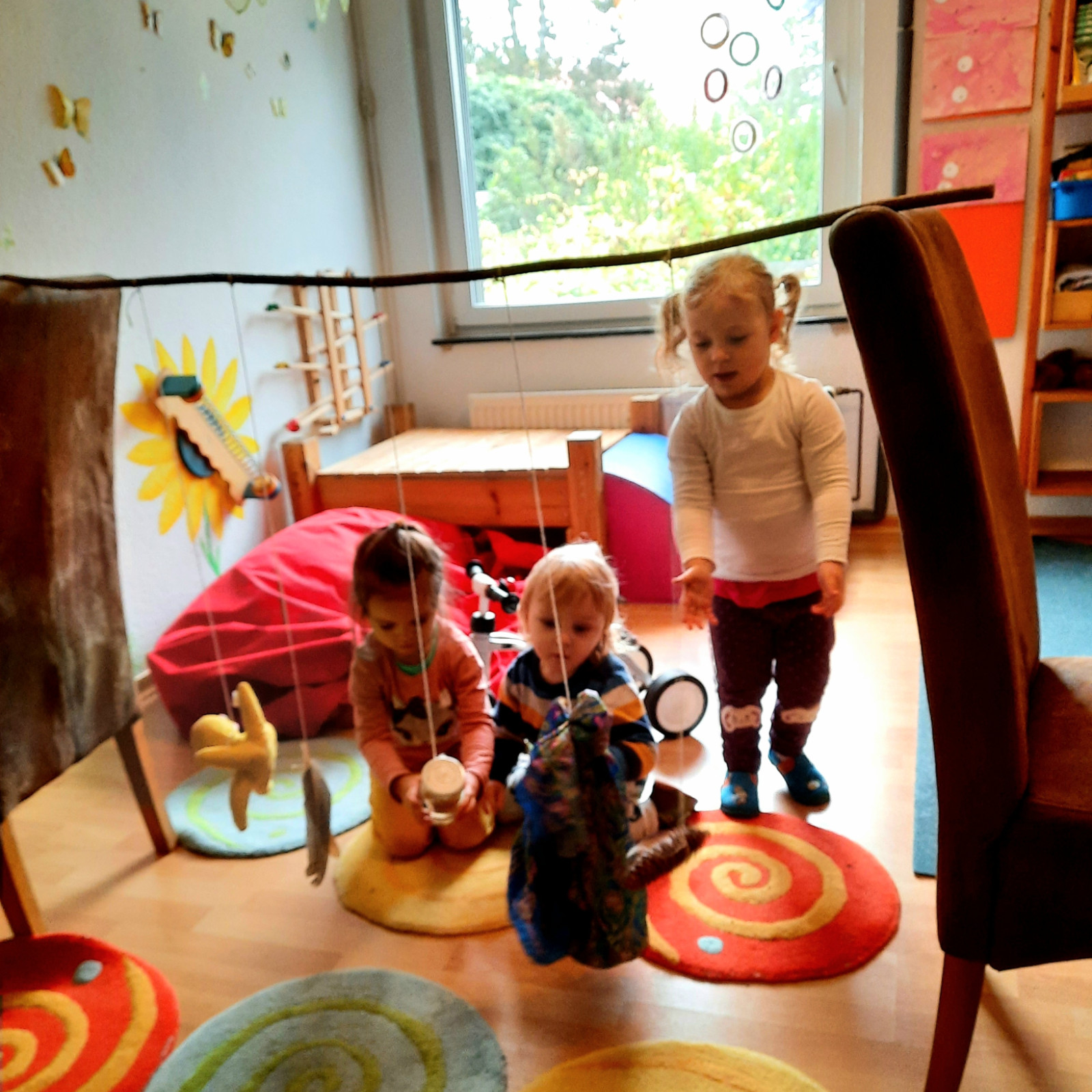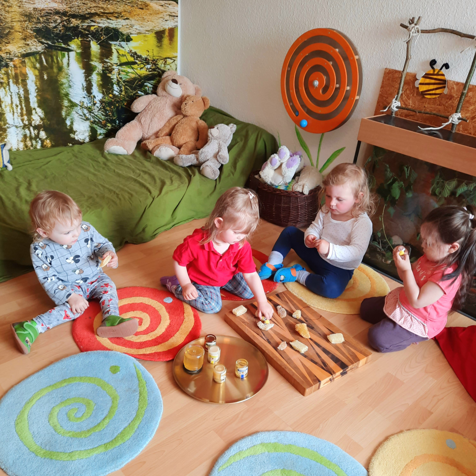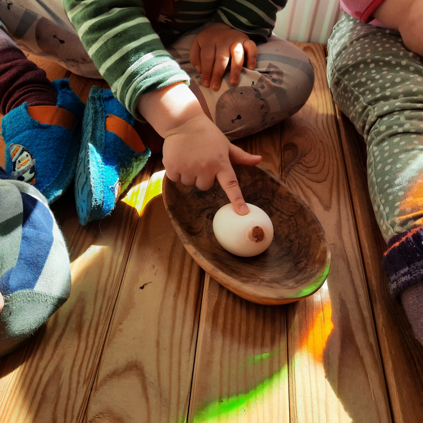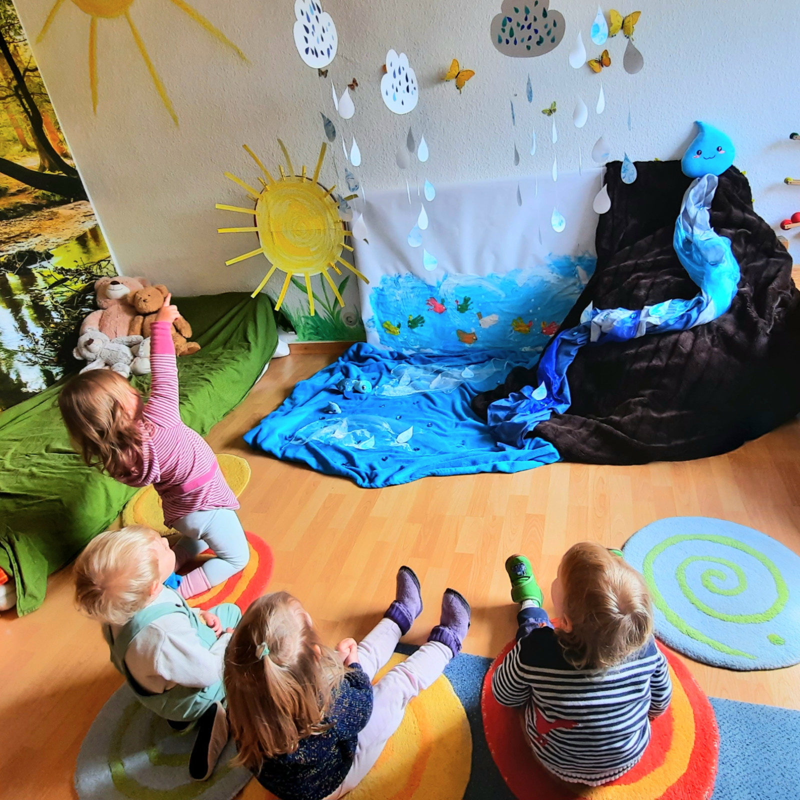 Wenn alle angekommen sind, gibt es viele Sachen, die wir machen. Wir musizieren gerne und viel, wir schnuppern jeden Tag ein bisschen Frischluft. Wir erforschen neugierig alles, was uns unter unsere Entdecker-Nase kommt. Wir bekommen Besuch oder gehen auf Tour, wir staunen und spielen, wir klecksen und kleistern, wir kullern und kichern, wir schmusen und schmatzen, wir teilen und toben und lesen und loben,...