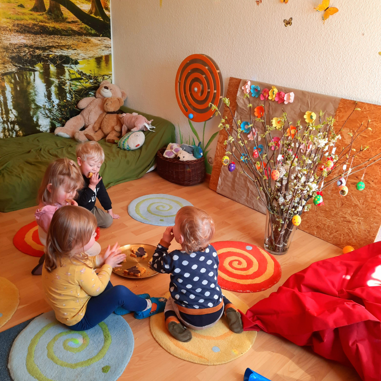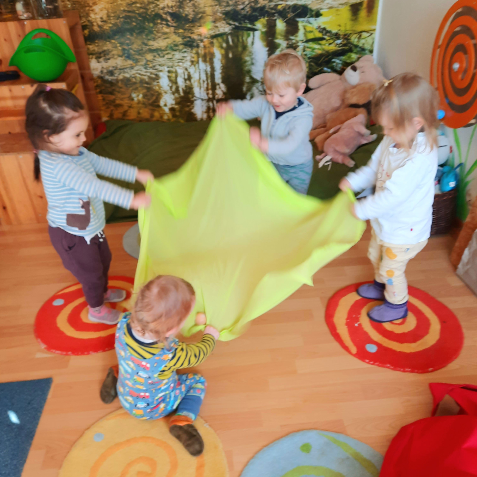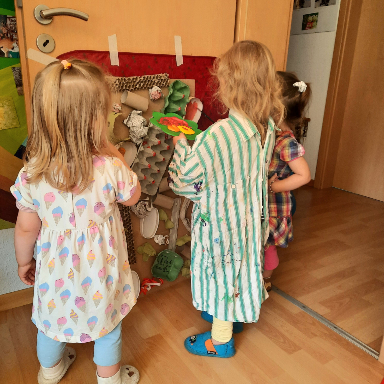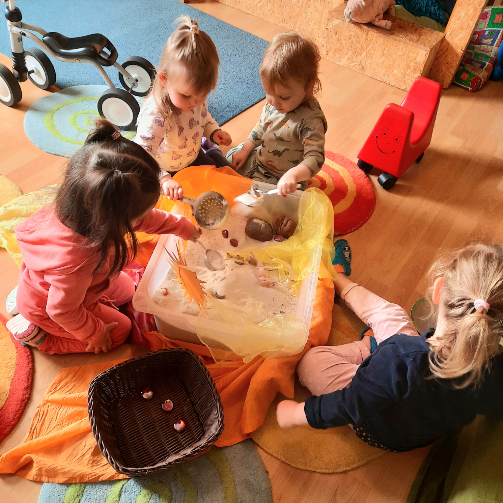 Wenn alle angekommen sind, gibt es viele Sachen, die wir machen. Wir musizieren gerne und viel, wir schnuppern jeden Tag ein bisschen Frischluft. Wir erforschen neugierig alles, was uns unter unsere Entdecker-Nase kommt. Wir bekommen Besuch oder gehen auf Tour, wir staunen und spielen, wir klecksen und kleistern, wir kullern und kichern, wir schmusen und schmatzen, wir teilen und toben und lesen und loben,...